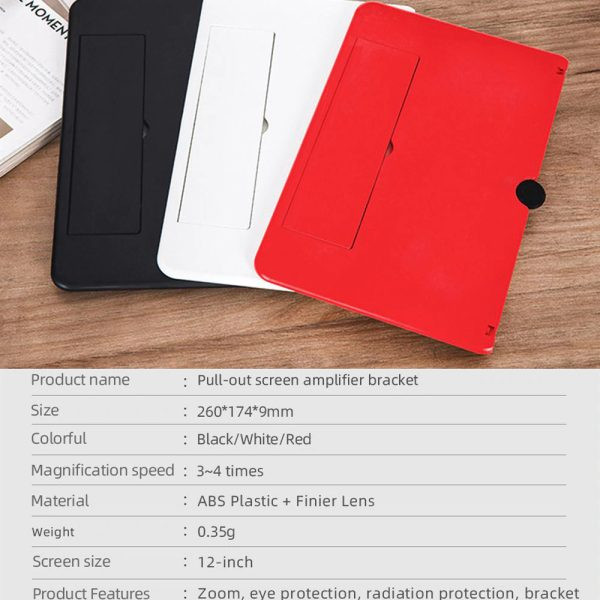 ا کیت بزرگنمایی صفحهنمایش گوشی موبایل، نگران مطالعه یا تماشای ویدیو با صفحهنمایشهای کوچک گوشیهایتان نباشید. این محصول قادر است خروجی صفحهنمایش گوشی موبایل را تا سهبرابر بزرگ و تماشای آن را راحتتر کند. مطالعهی PDFها و تماشای فایلهای ویدیویی در تبلتها، به خاطر صفحهنمایش بزرگتری که نسبت به گوشیهای موبایل دارند، راحتتر است. حروف، درشتتر و با فاصلهی بیشتری در کنار هم دیده میشوند و قابلیت تشخیص و صحیح خواندن آنها بیشتر است. این محصول می تواند سایز تصویر موبایل یا تبلت را 2 تا 3 برابر (با توجه به سایز صفحه موبایل یا تبلت) بزرگنمایی کند. این کیت بدون نیاز به نصب نرم افزار یا … کار می کند و با تمامی گوشی های موبایل و تبلت ها قابل استفاده است. این محصول خستگی و سوزش چشم در اثر نگاه کردن طولانی مدت به صفحه موبایل را از بین می برد و با استفاده از آن می توانید فیلم، کلیپ، تصاویر و … موبایل خود را در سایز بزرگ به راحتی تماشا کنید و لذت ببرید.