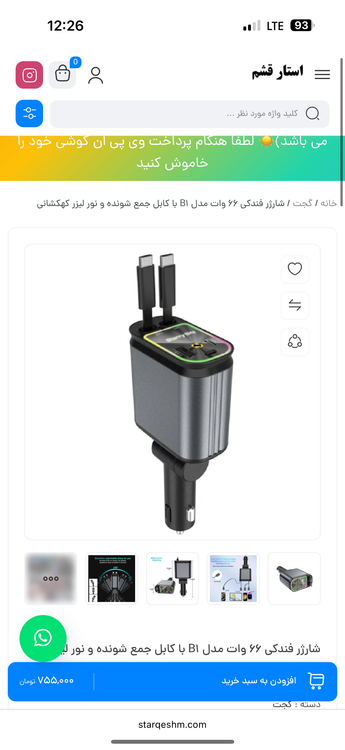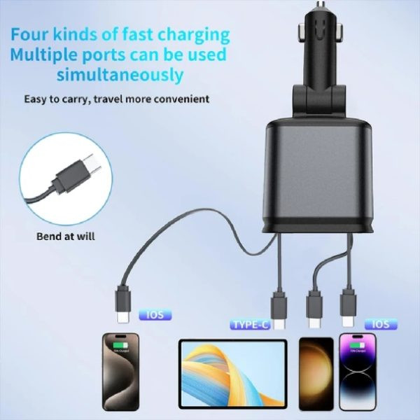 شارژر فندکی 66 وات با قابلیت کابل جمع شونده و نور کهکشانی