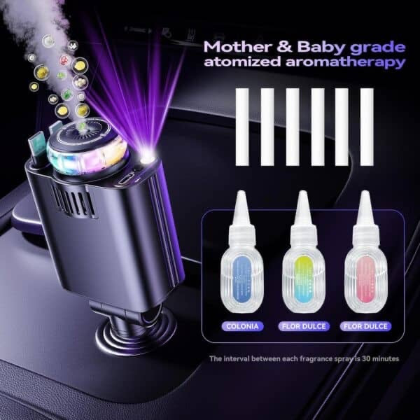 رایحه درمانی با تکنولوژی نانو: این دستگاه مجهز به یک پخشکننده عطر بدون آب است که با استفاده از اسانسهای گیاهی خالص و ایمن (مناسب برای مادر و نوزاد)، رایحهای دلانگیز را به صورت “نانو غبار” در فضای خودرو پخش میکند. این تکنولوژی بدون نیاز به آب یا حرارت، به رفع خستگی هنگام رانندگی و افزایش آرامش کمک میکند. به همراه این محصول، سه شیشه اسانس با رایحههای متفاوت عرضه میشود.
